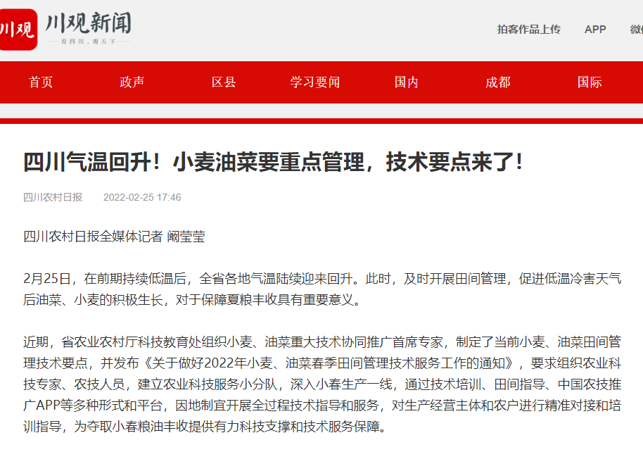 近期,省农业农村厅科技教育处组织小麦、油菜重大技术协同推广首席专家,制定了当前小麦、油菜田间管理技术要点,并发布《关于做好2022年小麦、油菜春季田间管理技术服务工作的通知》,要求组织农业科技专家、农技人员,建立农业科技服务小分队,深入小春生产一线,通过技术培训、田间指导、中国农技推广APP等多种形式和平台,因地制宜开展全过程技术指导和服务,对生产经营主体和农户进行精准对接和培训指导,为夺取小春粮油丰收提供有力科技支撑和技术服务保障。