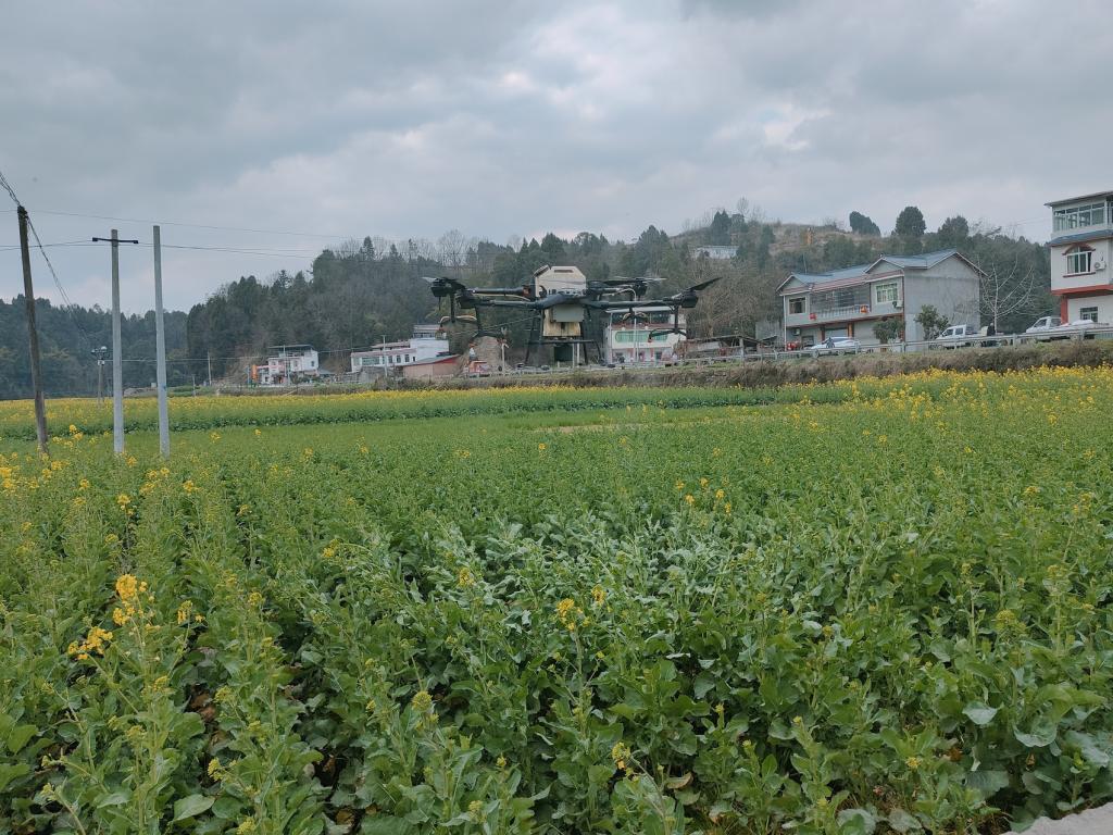 三台县景福镇白沙湾村,无人机防治油菜病虫害。
