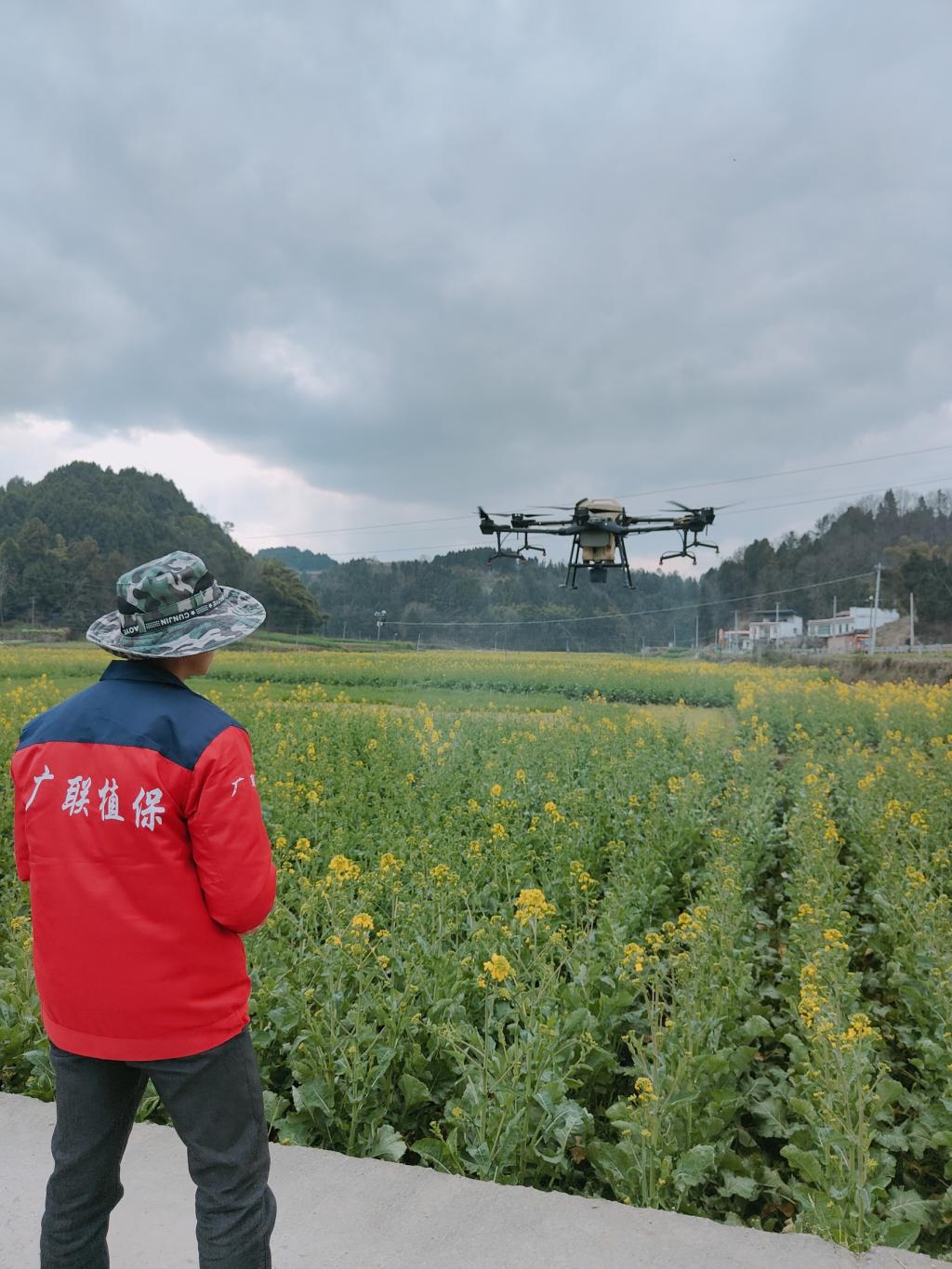 正是如此,近期景福镇的油菜田里,每天都有10余台无人机同时作业。“一台无人机每天可以防治200—300亩,效率是人工的50倍以上。”三台县广联农业植保专业合作社负责人吕开广说,今年小春合作社整合了106台无人机,聘请了90名无人机飞手,一共承担了14余万亩油菜的统防统治工作。