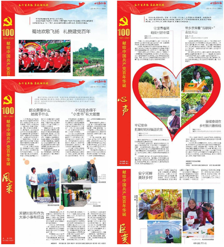 为铭记这一重要的历史时刻,川农报隆重推出”奋斗百年路 启航新征程——献给中国共产党百年华诞“特别报道,以及系列海报、视频歌曲等,为敬爱的党唱响了新时代“山歌”。围绕《心声》《欢庆》《风采》《巨变》《见证》《感恩》《奋进》等主题,我们献上了来自十里八乡最纯朴的祝福,表达了蜀乡干群永远跟党走的决心!