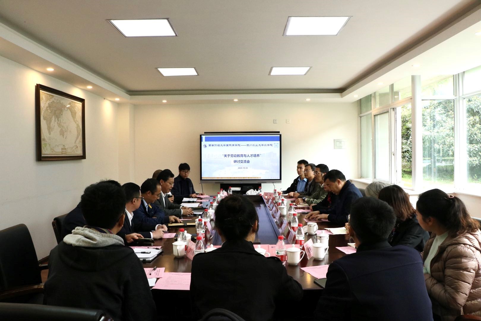 10月28日下午,教务处处长李廷轩,农学院党委副书记(主持工作)黎明艳,党委副书记、副院长王西瑶及相关系室负责人前往西南财经大学国际商学院召开人才培养与劳动教育交流研讨会。西南财经大学教务处处长汤火箭、国际商学院领导专家、专业课教师、辅导员以及学生代表参加研讨。