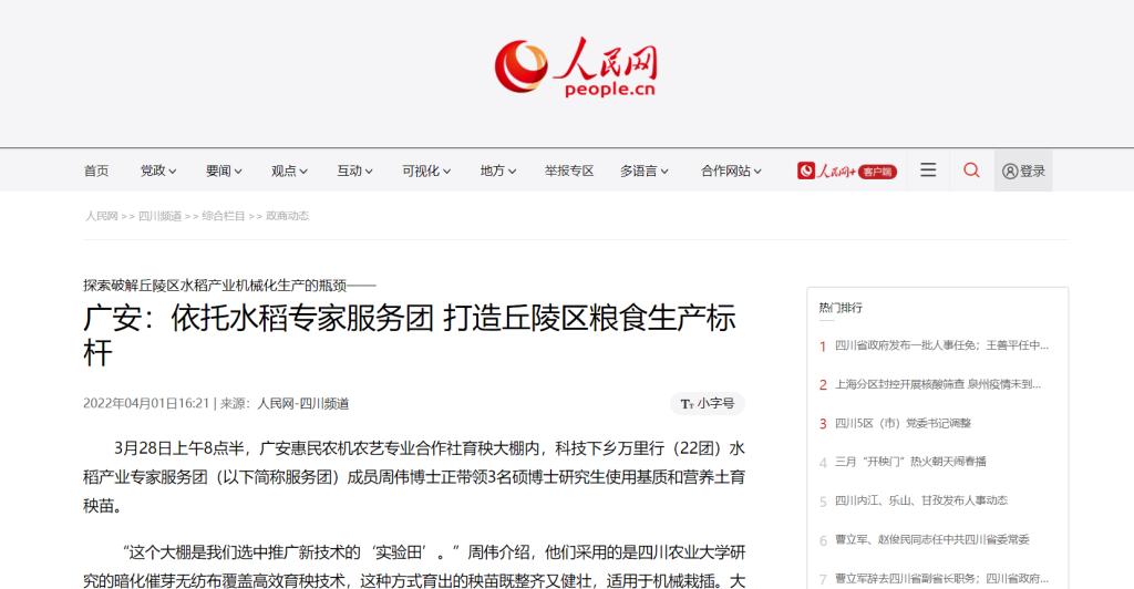 发展要善于借力,还要善于借智。由四川省委组织部组建的科技下乡万里行专家服务团,每年将以科技下沉、人才下沉为主要内容,培育一批“土专家”“田秀才”,助力巩固拓展脱贫攻坚成果、全面推进乡村振兴。“专家服务团的成立为广安提供了技术支撑。”广安市农业农村局农技站站长秦玉霞介绍,广安积极抢抓专家服务团对口帮扶广安的机遇,请专家们出谋划策,探索破解丘陵区水稻产业机械化生产的瓶颈。