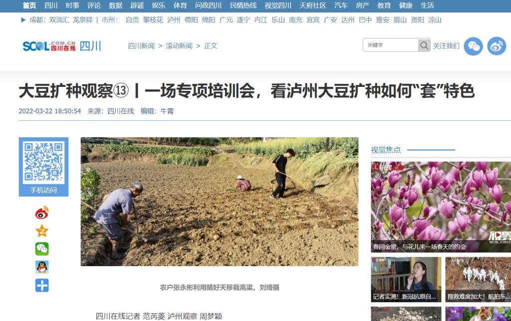 今年,泸州将扩种大豆15.5万亩。经请示省农业农村厅同意,我们把大豆扩面的重点放在高粱、大豆、油菜一年三熟套作带状种植上,大豆种植重点放在发展夏播大豆上。