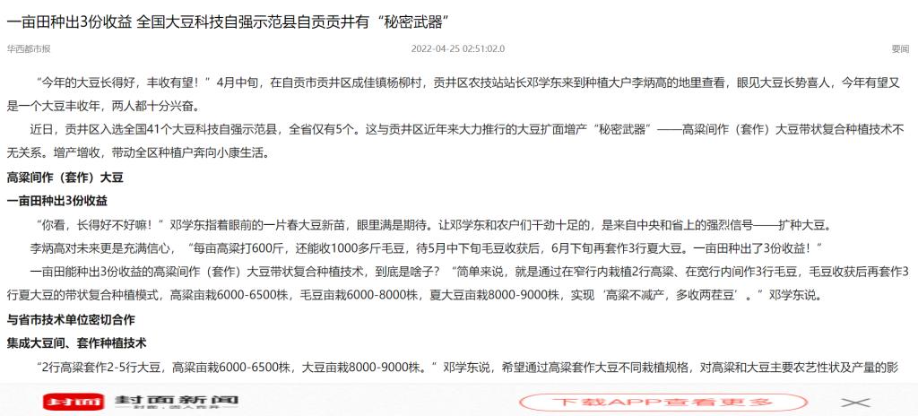 目前,贡井区正以成佳、建设、龙潭等乡镇为核心,建设20公里套作大豆产业示范带,建立大豆良种扩繁基地,2022年全区大豆套作扩种面积达到2万亩,“高粱亩产300公斤、大豆亩产130公斤,亩均新增利润1000余元”的目标有望实现。