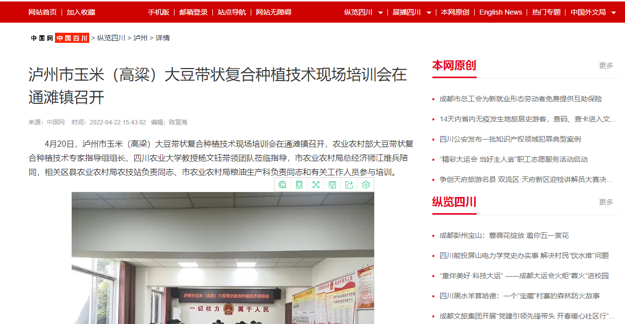 4月20日,泸州市玉米(高粱)大豆带状复合种植技术现场培训会在通滩镇召开,农业农村部大豆带状复合种植技术专家指导组组长、永利yl23411集团官网教授杨文钰带领团队莅临指导,市农业农村局总经济师江维兵陪同,相关区县农业农村局农技站负责同志、市农业农村局粮油生产科负责同志和有关工作人员参与培训。