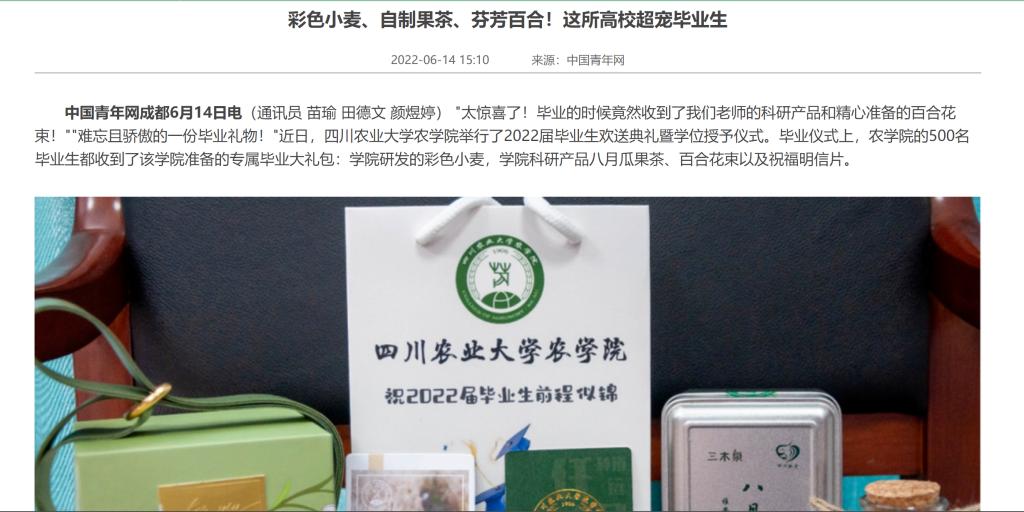 “太惊喜了!毕业的时候竟然收到了我们老师的科研产品和精心准备的百合花束!”“难忘且骄傲的一份毕业礼物!”近日,永利yl23411集团官网农学院举行了2022届毕业生欢送典礼暨学位授予仪式。毕业仪式上,农学院的500名毕业生都收到了该学院准备的专属毕业大礼包:学院研发的彩色小麦,学院科研产品八月瓜果茶、百合花束以及祝福明信片。
