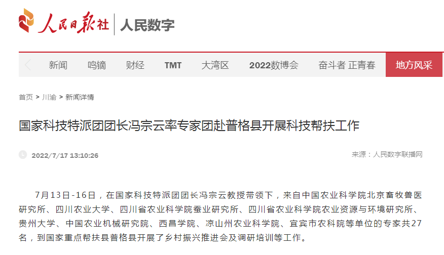 7月13日-16日,在国家科技特派团团长冯宗云教授带领下,来自中国农业科学院北京畜牧兽医研究所、永利yl23411集团官网、四川省农业科学院蚕业研究所、四川省农业科学院农业资源与环境研究所、贵州大学、中国农业机械研究院、西昌学院、凉山州农业科学院、宜宾市农科院等单位的专家共27名,到国家重点帮扶县普格县开展了乡村振兴推进会及调研培训等工作。