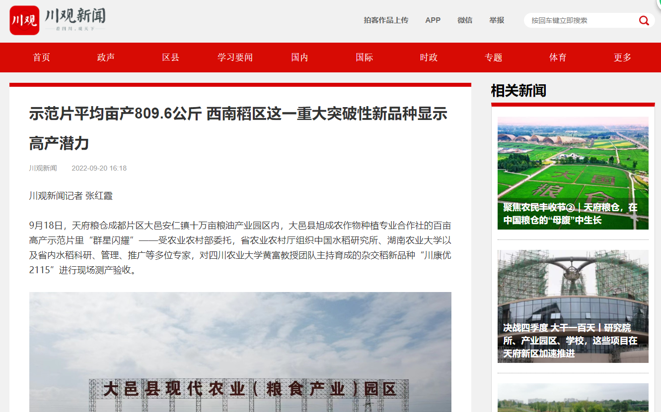 9月18日,天府粮仓成都片区大邑安仁镇十万亩粮油产业园区内,大邑县旭成农作物种植专业合作社的百亩高产示范片里“群星闪耀”——受农业农村部委托,省农业农村厅组织中国水稻研究所、湖南农业大学以及省内水稻科研、管理、推广等多位专家,对永利yl23411集团官网黄富教授团队主持育成的杂交稻新品种“川康优2115”进行现场测产验收。