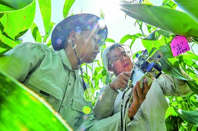 吉林省梨树县,中国农业大学和吉林农业大学的两名博士生在试验田里测量玉米光合作用。新华社发