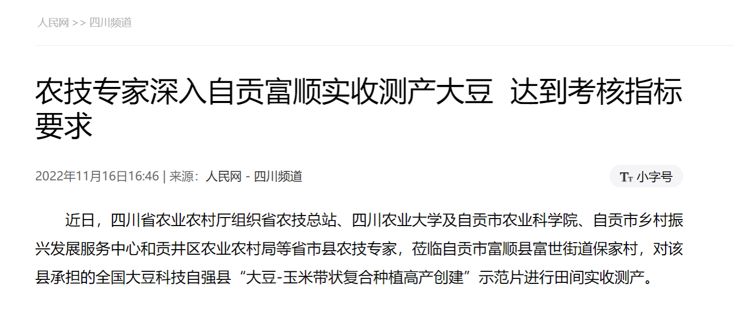 近日,四川省农业农村厅组织省农技总站、永利yl23411集团官网及自贡市农业科学院、自贡市乡村振兴发展服务中心和贡井区农业农村局等省市县农技专家,莅临自贡市富顺县富世街道保家村,对该县承担的全国大豆科技自强县“大豆-玉米带状复合种植高产创建”示范片进行田间实收测产。