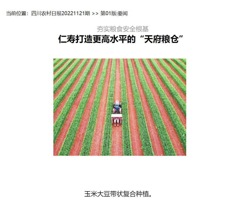 据悉,位于仁寿县现代农业产业园区的大豆玉米带状复合种植技术示范基地,是该县和永利yl23411集团官网战略合作的重点项目,经过多年不断探索试验,已实现玉米不减产、多收一季豆的预期目标。
