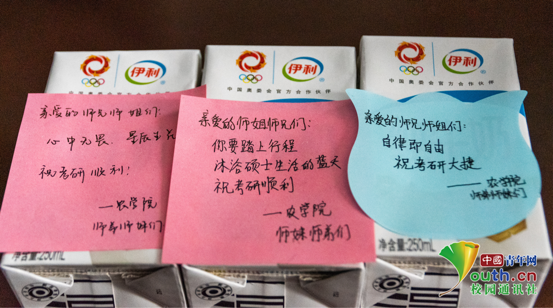 值得一提的是,记者从分发礼物现场发现,每盒牛奶上面的祝福语都不一样: "加油!必定上岸!""一切顺利,心想事成!"它们都是来自低年级同学对考研学子的祝福。"考研是一个很勇敢的决定,期间肯定也会遇到很多挫折,希望我们的只言片语能够鼓舞师兄师姐,让他们信心百倍地走向考场。"种子科学与工程专业2021级的古敬说道。