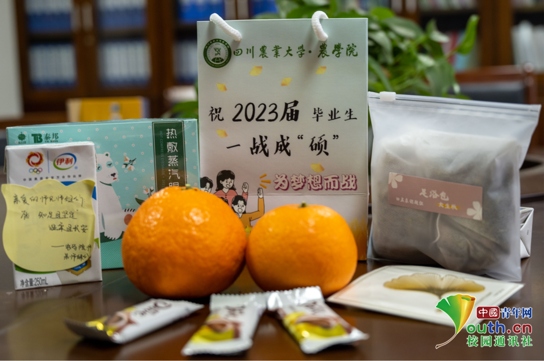 与此同时,采访现场沈丽淘告诉记者,考研礼包中的橙子、巧克力、牛奶和书签也受到一致好评。"吃完巧克力和橙子后心里甜甜的,复习时心情都好了许多。"考研学生胡雨玲回忆道,"一早来到教室准备复习的时候就看到桌子上的礼物,很惊喜!但更没想到的是,它们还有如此美好的寓意。"据介绍,巧克力、牛奶、橙子是农学院为祝愿考研学子在复习过程中'巧克'难关,驰骋考场'牛'气冲天,录取结果心想事'橙'而准备的,银杏书签上的"前程似锦"则是对考研学子最真诚的祝福。