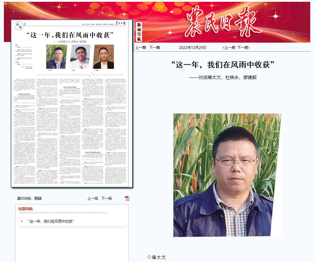 杜焕永:作为“新农人”,我们应该深刻认识到身上肩负的使命,就是要为确保国家粮食安全贡献一份绵薄之力,就是要在我国从传统农业走向现代农业、从农业大国走向农业强国的新征程上贡献“新农人”的力量。