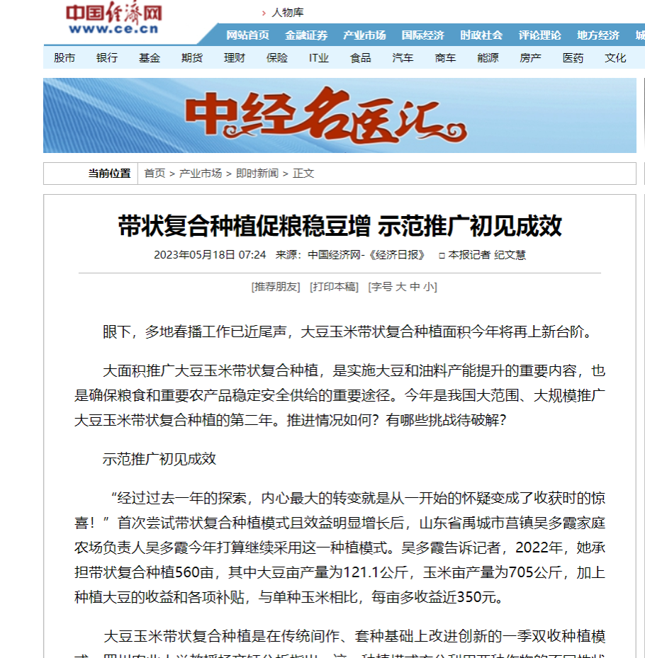 “经过过去一年的探索,内心最大的转变就是从一开始的怀疑变成了收获时的惊喜!”首次尝试带状复合种植模式且效益明显增长后,山东省禹城市莒镇吴多霞家庭农场负责人吴多霞今年打算继续采用这一种植模式。吴多霞告诉记者,2022年,她承担带状复合种植560亩,其中大豆亩产量为121.1公斤,玉米亩产量为705公斤,加上种植大豆的收益和各项补贴,与单种玉米相比,每亩多收益近350元。