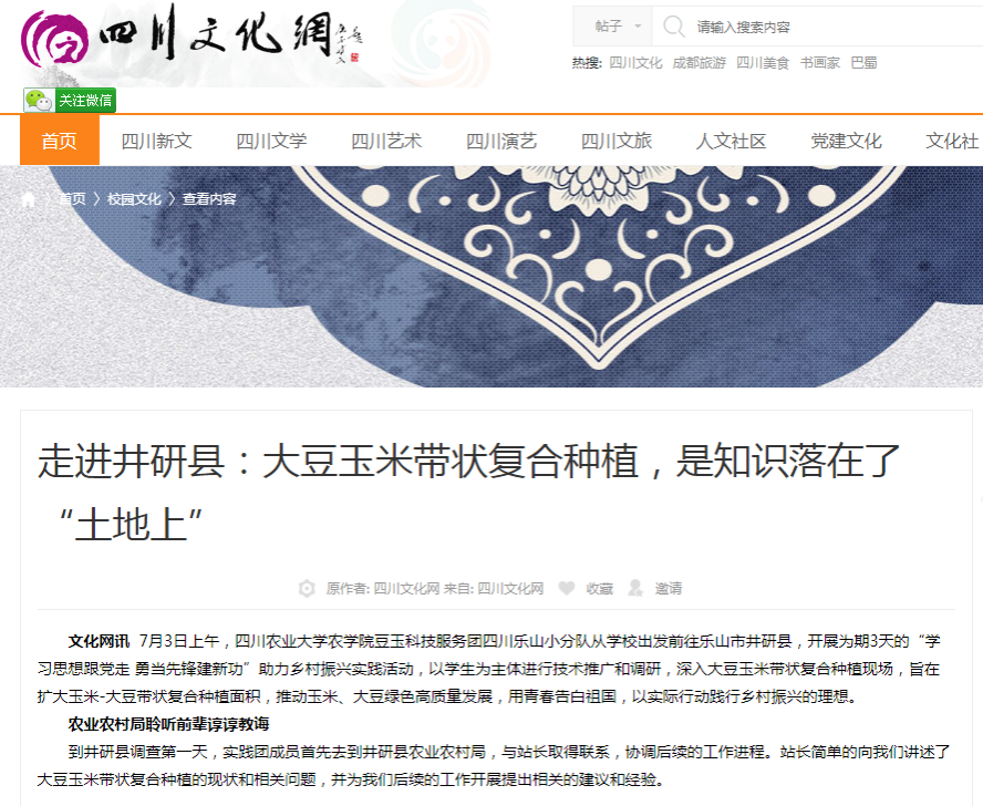 7月3日上午,永利yl23411集团官网农学院豆玉科技服务团四川乐山小分队从学校出发前往乐山市井研县,开展为期3天的“学习思想跟党走 勇当先锋建新功”助力乡村振兴实践活动,以学生为主体进行技术推广和调研,深入大豆玉米带状复合种植现场,旨在扩大玉米-大豆带状复合种植面积,推动玉米、大豆绿色高质量发展,用青春告白祖国,以实际行动践行乡村振兴的理想。