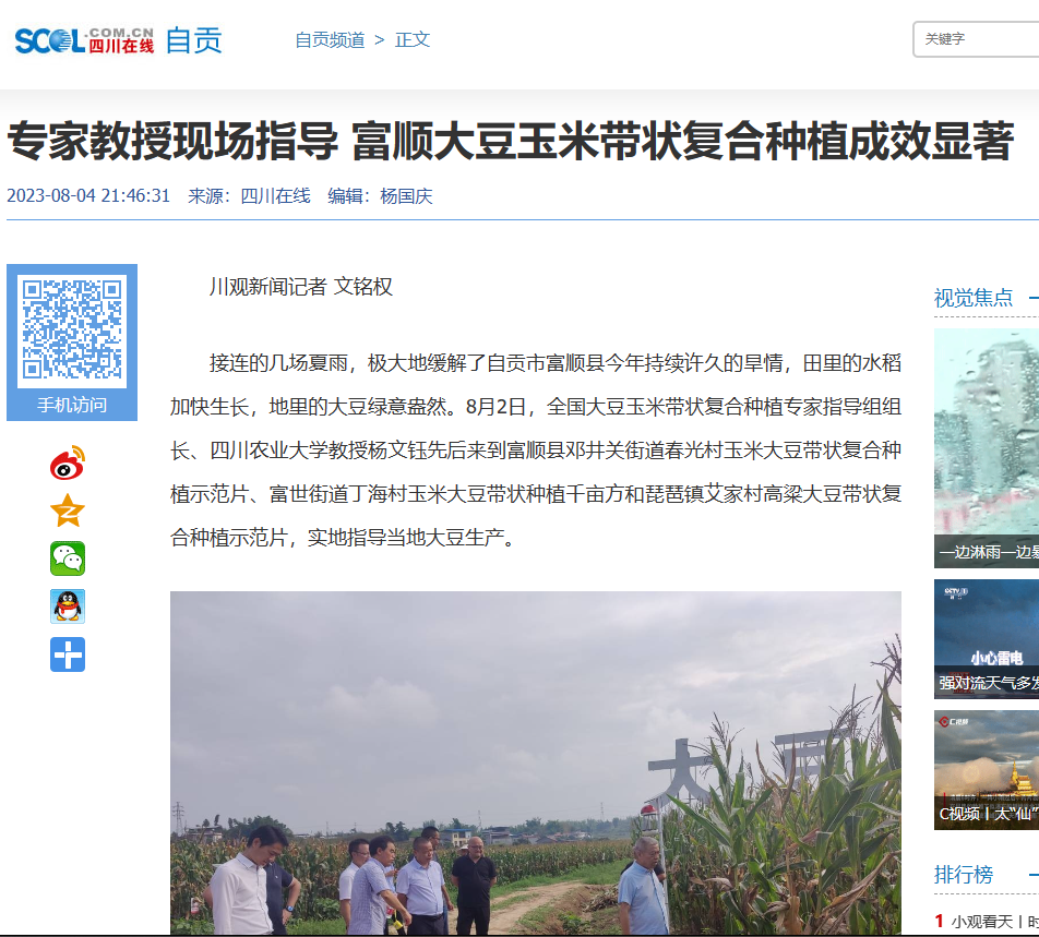 接连的几场夏雨,极大地缓解了自贡市富顺县今年持续许久的旱情,田里的水稻加快生长,地里的大豆绿意盎然。8月2日,全国大豆玉米带状复合种植专家指导组组长、永利yl23411集团官网教授杨文钰先后来到富顺县邓井关街道春光村玉米大豆带状复合种植示范片、富世街道丁海村玉米大豆带状种植千亩方和琵琶镇艾家村高粱大豆带状复合种植示范片,实地指导当地大豆生产。