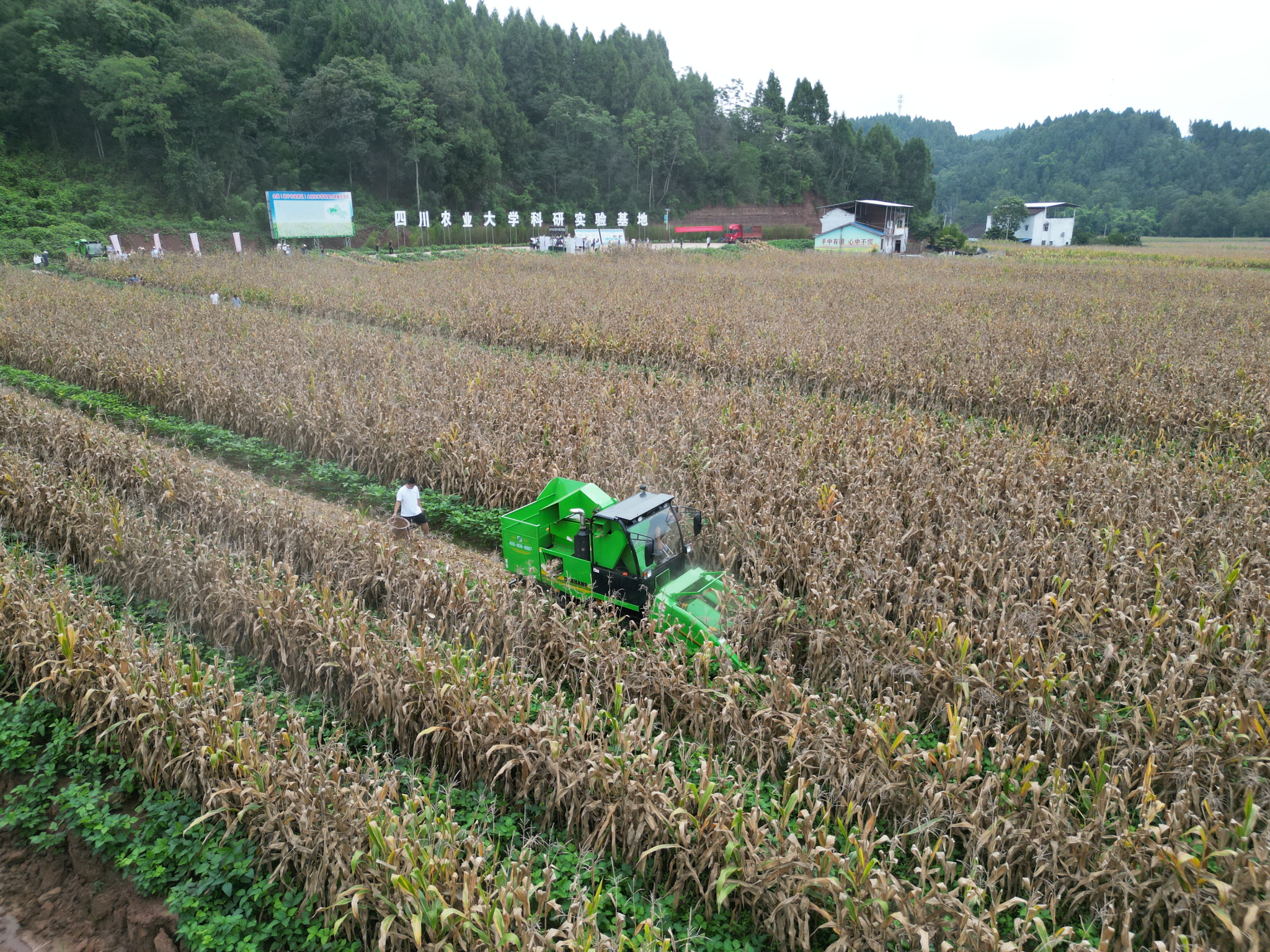 行进的收割机源源不断地将玉米棒收获,玉米秸秆被粉碎还田以培肥地力,为春耕工作打下基础,一旁的夏大豆绿意盎然。春玉米的丰收成绩给了承包示范片的种植大户奉光荣极大鼓舞,他说“川农大专家的技术就是得行,我现在开始期待大豆产量了!”
