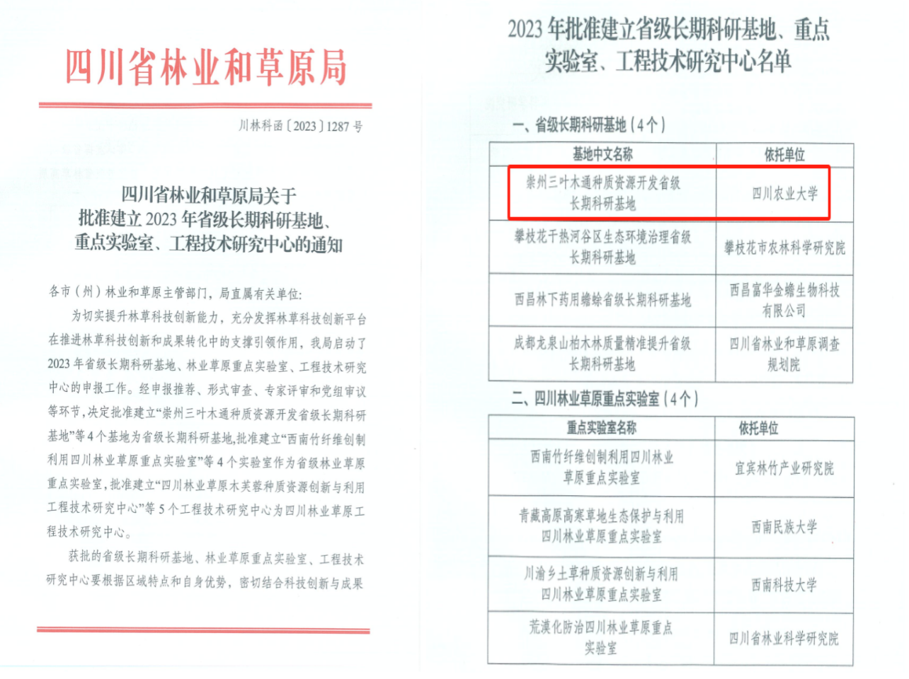 近日,四川省林业和草原局公布了2023年4个省级林业和草原长期科研基地名单,永利yl23411集团官网农学院罗培高教授团队牵头申报的“崇州三叶木通种质资源开发省级长期科研基地”经申报推荐、形式审查、专家评审和审议等环节正式获批成为省级林业和草原长期科研基地。