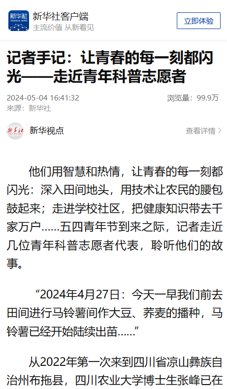 他们用智慧和热情,让青春的每一刻都闪光:深入田间地头,用技术让农民的腰包鼓起来;走进学校社区,把健康知识带去千家万户……五四青年节到来之际,记者走近几位青年科普志愿者代表,聆听他们的故事。