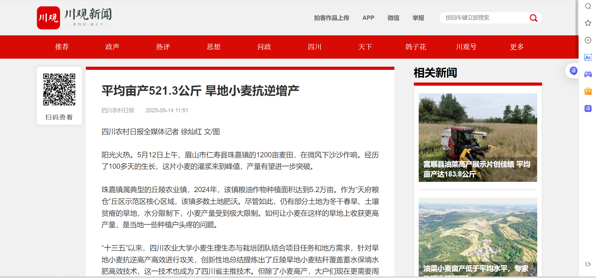 阳光火热。5月12日上午,眉山市仁寿县珠嘉镇的1200亩麦田,在微风下沙沙作响。经历了100多天的生长,这片小麦的灌浆来到峰值,产量有望进一步突破。