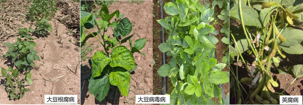 夏大豆根腐病为害后植株枯死,缺苗断垄(左图),大豆病毒病为害导致叶片皱缩或边缘变黄内卷(中图),以及中后期大豆荚腐病(右图)。