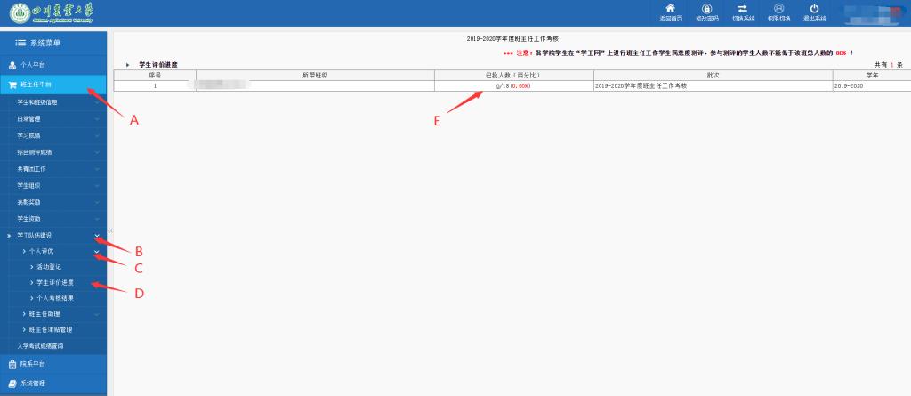 班主任通过学生处主页登录“学生管理工作系统”→A.班主任平台→B.学工队伍建设→C.个人评优→D.学生评价进度→E.已投人数→查看未参与打分同学→提醒小班同学完成打分