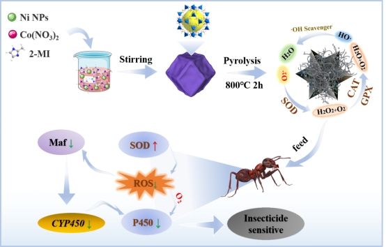 红火蚁作为一种原产于南美洲的入侵物种,在我国南方广泛分布并对生态环境造成严重破坏,此外红火蚁对化学杀虫剂产生的耐受性导致其极难防治。纳米酶作为一种稳定、低成本的人工酶,可以模拟天然酶的活性,并通过与杀虫剂的协同作用显著提高杀虫活性。本研究通过高温热解,获得了包裹在N-CNT中的CoNi合金纳米材料NiCoNC;该材料的中空结构增加了暴露的可接触活性位点,加速了电子传递和结构稳定性,同时,NiCoNC在工蚁体内表现出的超氧化物歧化酶活性可有效消除活性氧,进而通过抑制转录因子Maf下调P450基因CYP4C1、CYP6A14和CYP9e2的表达,导致红火蚁对杀虫剂的解毒代谢能力减弱,最终降低了工蚁对杀虫剂的耐受性。本研究突破传统杀虫剂防治红火蚁思维限制,利用纳米酶技术结合传统杀虫剂防治红火蚁,为纳米酶助力传统杀虫剂实现药物减量增效作用提供了新的思路。