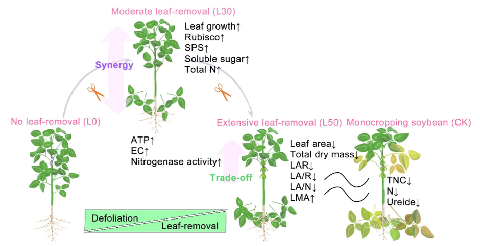 课题组前期在《The Crop Journal》报道,大豆玉米带状套作延长了花后玉米和大豆的绿叶持续时间,协同促进籽粒灌浆提高了产量。而花后单作大豆的大面积落叶对光合和产量产生不利影响,关于落叶的具体原因及其对源库功能器官的塑造机制还知之甚少。通过为期4年的落叶跟踪以及对套作大豆的剪叶模拟,研究表明,花后单作大豆严重的冠层郁闭导致了地下根瘤光合碳分配不足,减少了对地上叶片的养分贡献,最终导致大豆中下层叶片“牺牲”式脱落。剪叶模拟揭示了叶片和根瘤生长发育之间的权衡和可塑性,增强叶面积在植株功能性状的中心性将更有利于植株源库协调和豆荚的养分积累。本研究阐明了花后大豆叶片凋落和叶瘤可塑性机制,并强调了带状套作如何优化源库协调以增强光合作用和固氮。本研究成果为提高带状复合种植模式下的大豆和玉米产量提供了新的理论支撑和实践方案。