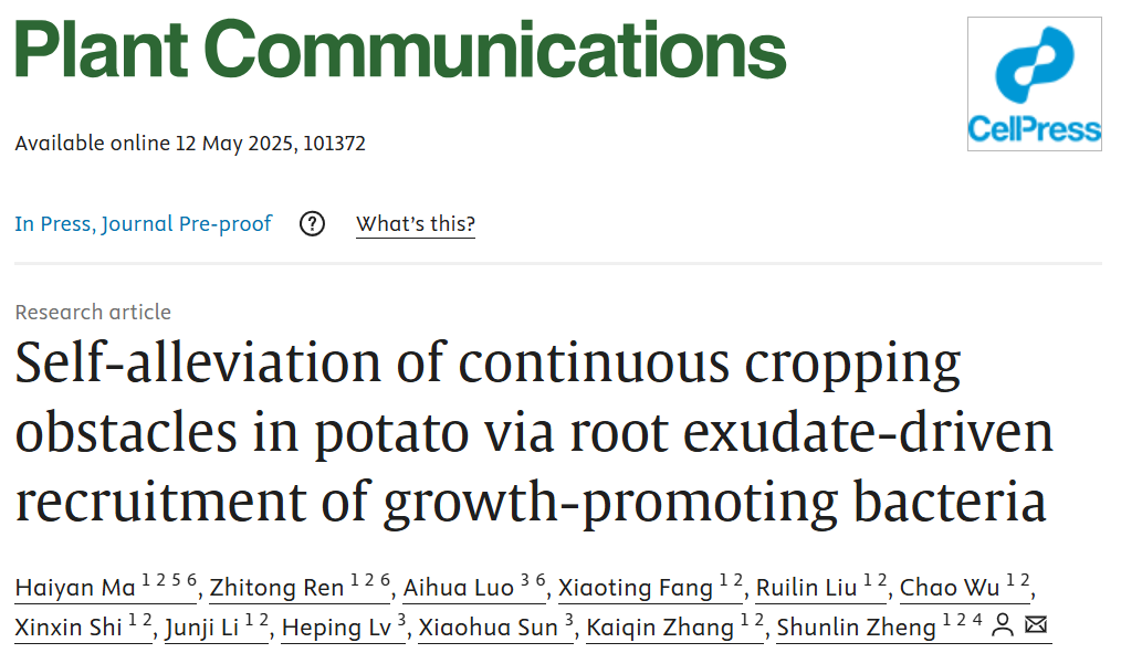 近日,永利yl23411集团官网郑顺林课题组在Plant Communications期刊上发表了题为“Self-alleviation of continuous cropping obstacles in potato via root exudate-driven recruitment of growth-promoting bacteria”的文章。本研究首次揭示了马铃薯自主适应连作障碍的机制,产生连作障碍的马铃薯植株利用根系分泌物川陈皮素定向招募Pantoeasp. MCC16提高根际IAA水平,进而提高苗期不定根数量,缓解连作障碍。这一发现有助于加深根际微生物对马铃薯连作障碍调控机制的理解,也为马铃薯连作障碍的绿色防控提供了理论支撑与科学依据。