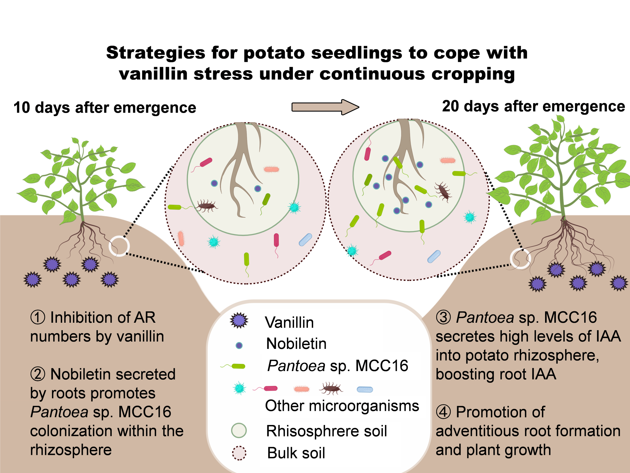 该研究通过连作土壤灭菌试验、根际菌群移植试验、目标功能菌筛选验证试验、马铃薯苗期根系分泌物浇灌试验、目标代谢物筛选验证试验、目标代谢物招募目标功能菌株试验以及目标功能菌及目标代谢物对马铃薯连作障碍缓解作用等系列试验来展开,发现马铃薯植株自主适应连作障碍主要体现在出苗后第20到第30天不定根数量的显著提升,这与连作马铃薯出苗后第20天的根际微生物提高根际土壤中IAA的水平密切相关。使用16S rRNA绝对定量测序对根际细菌群落进行分析,发现连作改变了根际微生物群落结构,Pantoeasp. MCC16的丰度显著增加且只在出苗后第20天出现,外源Pantoeasp. MCC16菌液浇灌可显著提高连作马铃薯根际IAA水平且不定根数量显著增加。进一步研究发现,连作马铃薯出苗后第20天的根系分泌物会显著提高根际土壤中Pantoeasp. MCC16丰度。根据非靶向代谢组学分析及外源代谢物浇灌试验,川陈皮素被鉴定为是招募Pantoeasp. MCC16到马铃薯根际定殖的主要物质。最后在连作土壤中施用川陈皮素或Pantoeasp. MCC16均可显著提高连作马铃薯产量。这些结果说明连作马铃薯可以自主分泌川陈皮素,招募高产IAA的Pantoeasp. MCC16,促使植物恢复功能特性并缓解连作障碍。