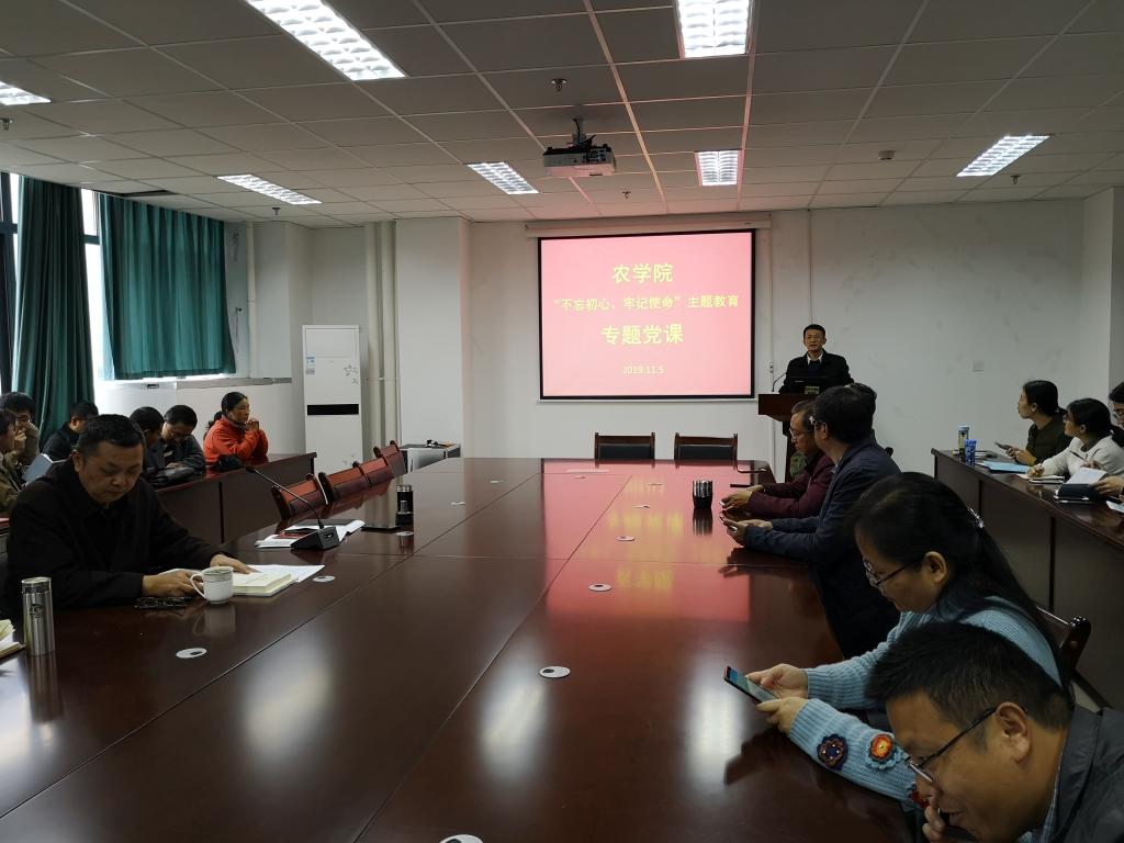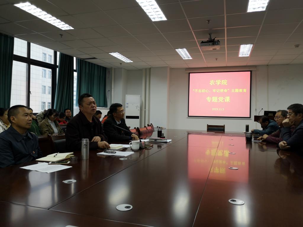 从9月份开始,农学院“不忘初心、牢记使命”主题教育已全面展开。按照学校“不忘初心、牢记使命”主题教育的工作安排,学院领导已分别于10月为联系的党支部党员上党课,11月5日,农学院领导在7教405会议室,再次为全院教师党员讲专题党课。