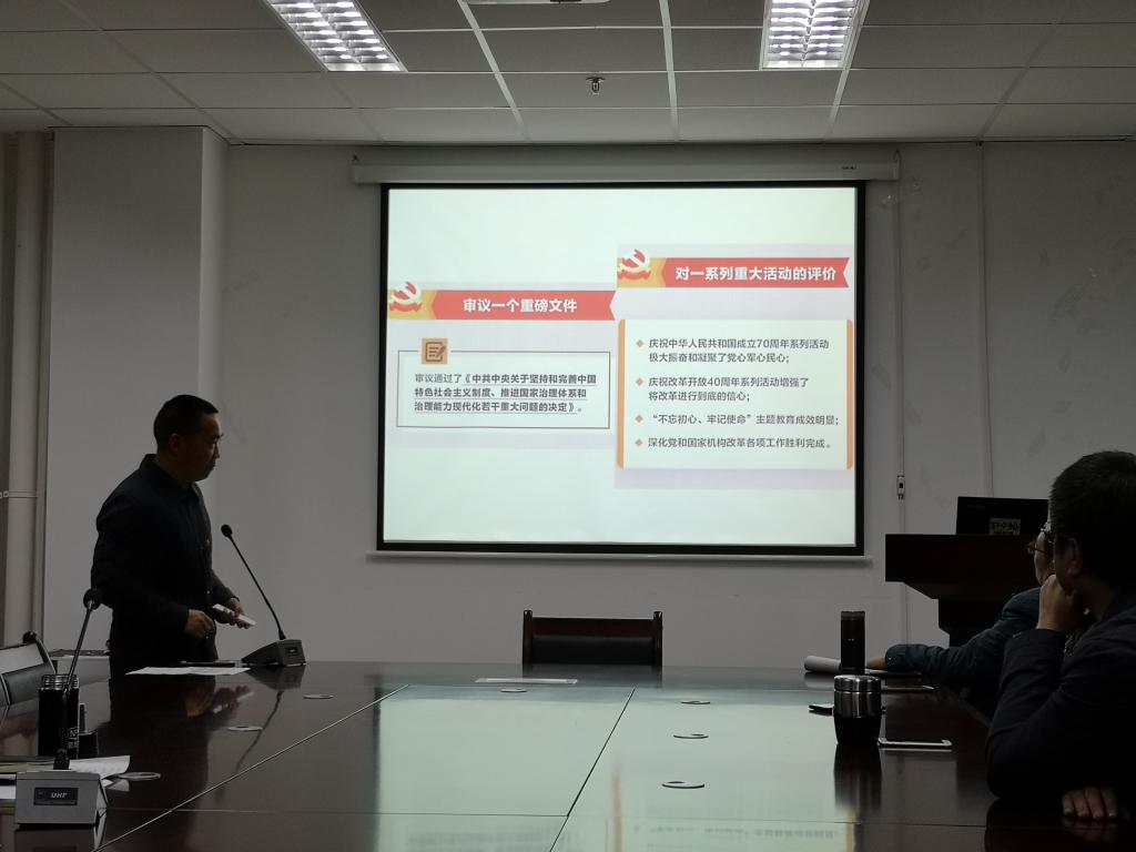 副院长、院党委委员任万军以图文并茂的形式,从“一个重磅文件”、“一个重要判断”、“十三个‘坚持’”、“一个总体目标”、“一个重大战略任务”等板块,带领党员同志共同学习了《十九届四中全会公报》希望党员同志们继续学习宣传贯彻全会精神,切实把思想和行动统一到全会精神上来,结合学校实际强化举措,狠抓落实,把学习贯彻全会精神与开展“不忘初心、牢记使命”主题教育结合起来,真正在学懂弄通做实上下功夫,进一步增强“四个意识”、坚定“四个自信”、做到“两个维护”。