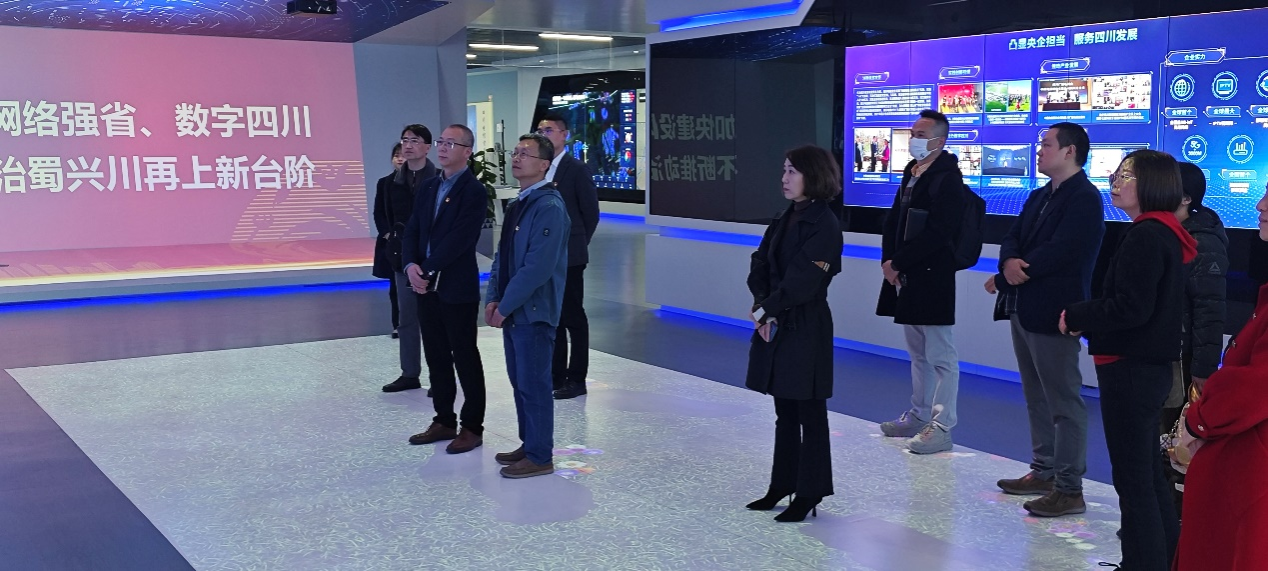 首先,天翼乡村科技有限公司党支部书记、总经理张致远等陪同参观了中国电信西部信息中心IDC机房和5G信息化展厅,并介绍了四川电信打造的魔系平台、云仓数配、数字乡村综合信息平台等信息化创新应用,以及实现数字乡村的发展、助力解决“三农问题”上的实例。
