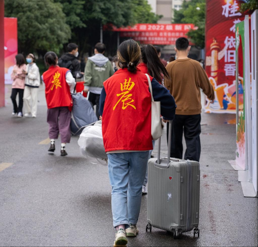 图为志愿者为新生搬运行李