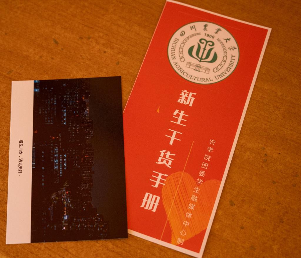 图为农学院为新生准备的新生手册和明信片
