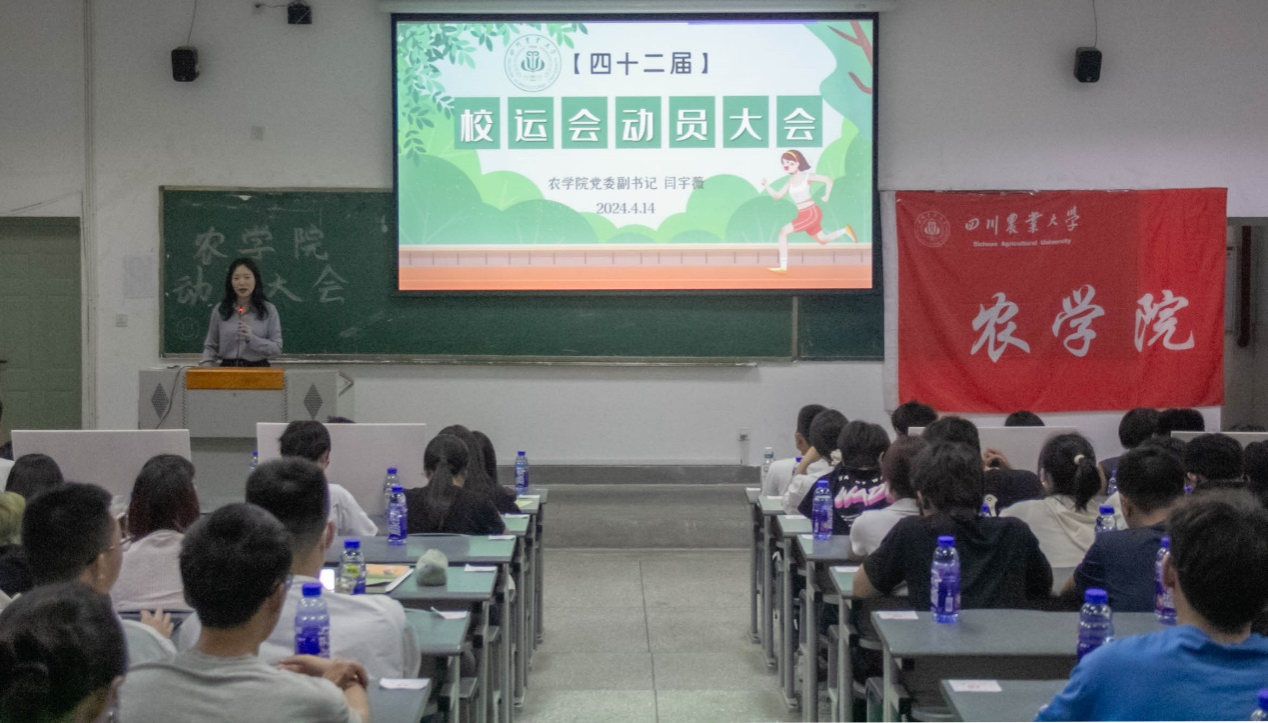 4月14日晚,农学院在4A-107隆重举行了第四十二届校运会动员大会。本次大会由党委副书记、纪委书记闫宇薇老师,党委办公室主任、团委书记唐骄萍老师,党委办公室刘琦老师,各训练队队长及全体运动员共同出席。大会由农学院学生会副主席岑佳锐同学主持。