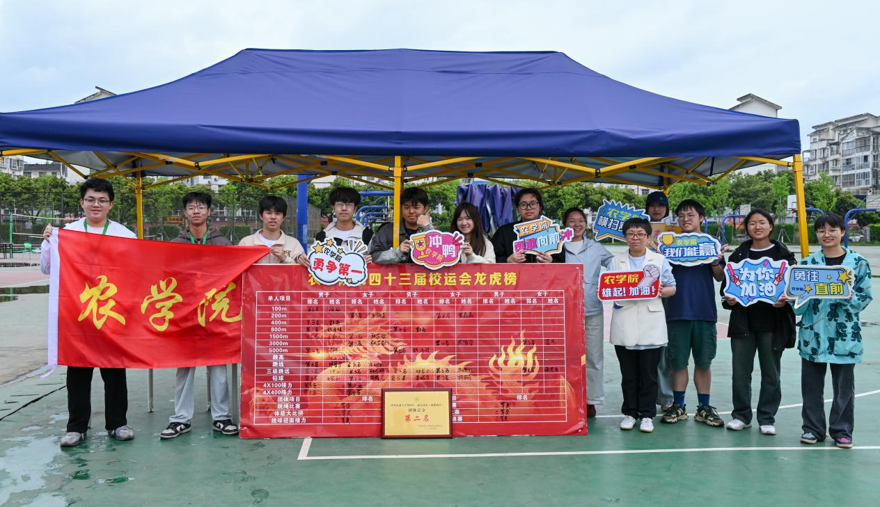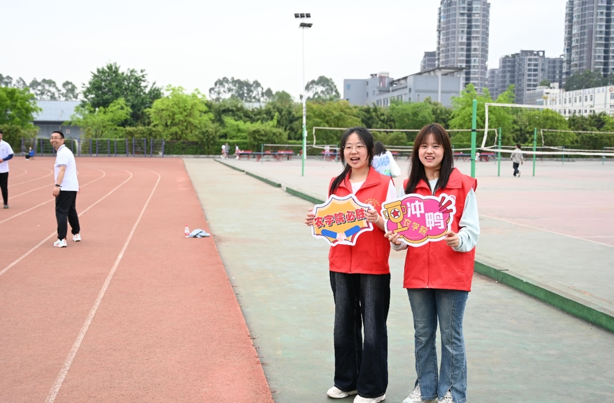 操场边,农学院的啦啦队手持定制的加油牌,助威口号节奏整齐。“农学院加油!农学院加油!”铿锵有力的呐喊声为比赛注入了活力。