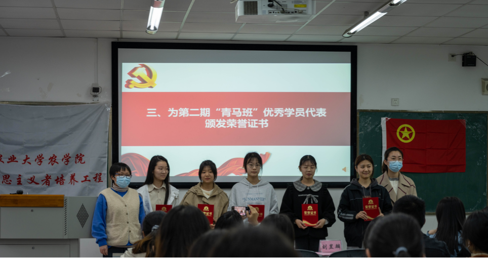 回望过去一年,老学员的优秀事迹仍然光辉闪耀。农学院学生会主席邓雅文宣读《关于授予第二期“青马工程”培养班学员结业证书和表彰优秀学员的决定》,刘昱麟、贾佳为第二期“青马班”学员代表颁发结业证书并为第二期“青马班”优秀学员代表颁发荣誉证书。随后,第二期“青马班”优秀学员代表韩雪发言:“在座的各位和我一样,身为‘青马班’学员要意识到,作为大学生要不断提升自我能力、提高思想觉悟。作为学生干部,谨记为大家服务的奉献精神,在自己的工作岗位上发光发热。”