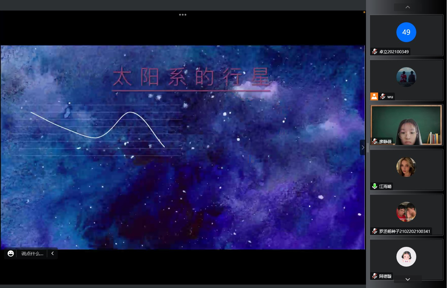 “为什么水星上没有水?”“外星人可能住在哪里?”团队成员江雨晴为孩子们带去一堂有趣而亲切的天文科普课。瑰丽的星云照片令人心生向往,动画演示用简单诙谐的语言解说了星球的形成过程,小小的课堂为孩子们打开了通往无限广阔的宇宙的大门,激发小学生对天文科学知识的好奇心与求知欲,引导他们认识自然、亲近自然。