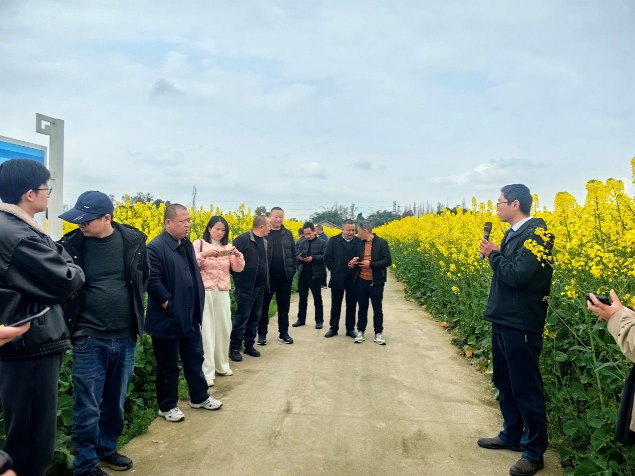 第二站团队一行来到崇州市燎原乡种粮大户杜刚的油菜地。飞机播种的油菜密密实实,但茎秆粗壮,高度一致,整齐划一的油菜花正在竞相绽放。预示着高产的长相,让观摩人员赞叹不绝。杜刚介绍了他的田间管理秘诀,吴永成总结了均衡生长对于高产创建的重要性,就油菜田前期杂草防治、肥料管理、近期田间管理要点与大户们进行了交流探讨。