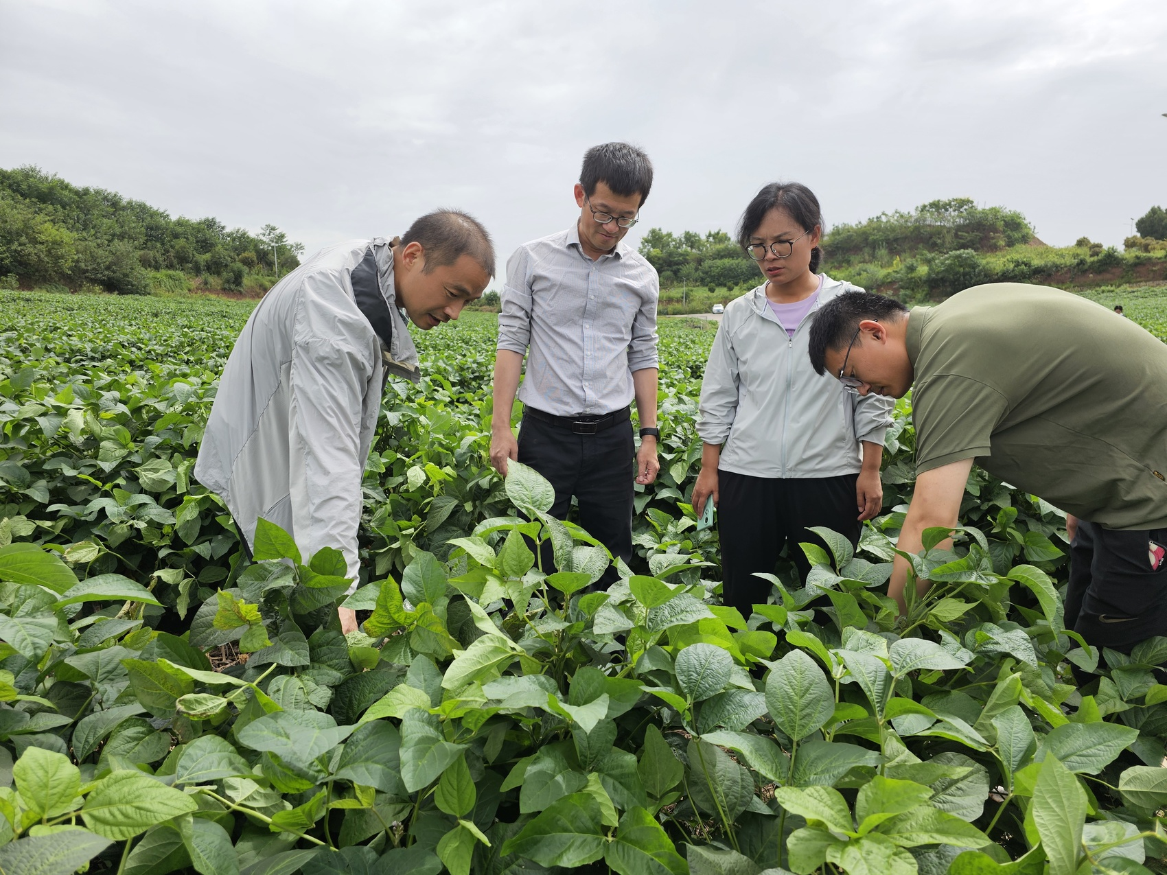 永利yl23411集团官网副教授常小丽和专家一起查看大豆长势。