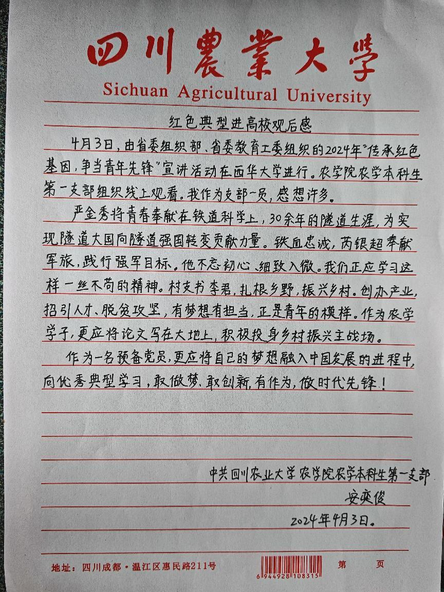 此次宣讲活动不仅是一次深刻的党性教育,更是一次精神的洗礼。通过聆听红色典型的先进事迹,师生党员更加坚定了自己的信仰和理想,更加明确了自己的使命和责任。我们要以这些红色典型为榜样,不忘初心,牢记使命,将个人的理想追求与国家和民族的发展紧密结合起来,投身于农业科研和人才培养工作中,为实现农业强国梦、中国梦贡献智慧和力量,为实现中华民族伟大复兴的中国梦贡献青春和力量。