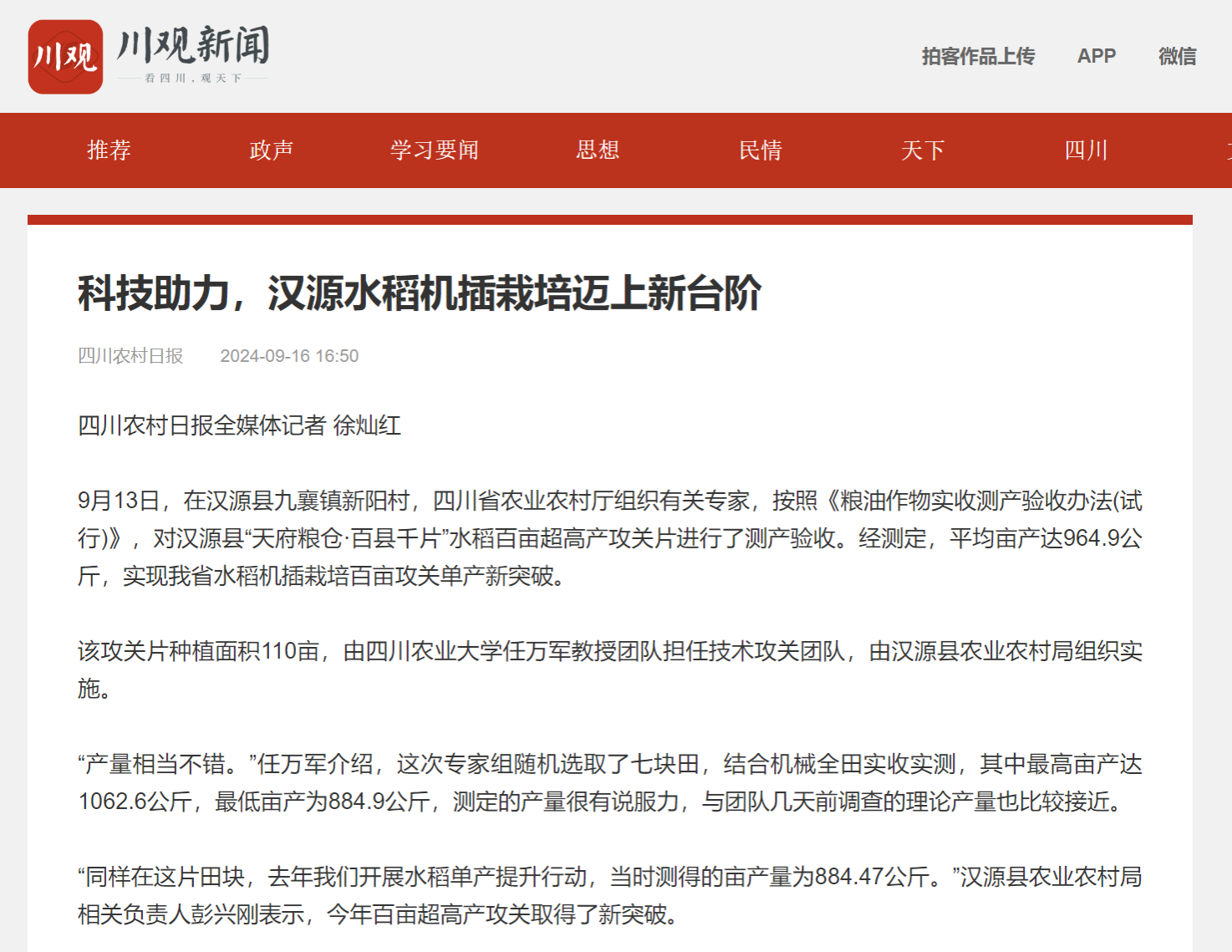 9月13日,在汉源县九襄镇新阳村,四川省农业农村厅组织有关专家,按照《粮油作物实收测产验收办法(试行)》,对汉源县“天府粮仓·百县千片”水稻百亩超高产攻关片进行了测产验收。经测定,平均亩产达964.9公斤,实现我省水稻机插栽培百亩攻关单产新突破。