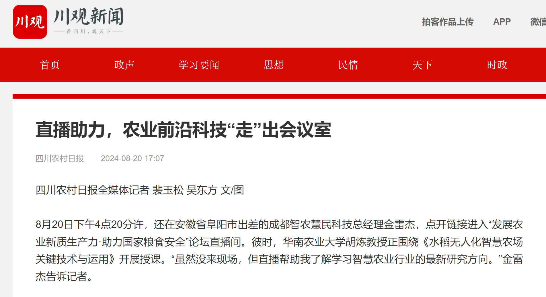 8月20日下午4点20分许,还在安徽省阜阳市出差的成都智农慧民科技总经理金雷杰,点开链接进入“发展农业新质生产力·助力国家粮食安全”论坛直播间。彼时,华南农业大学胡炼教授正围绕《水稻无人化智慧农场关键技术与运用》开展授课。“虽然没来现场,但直播帮助我了解学习智慧农业行业的最新研究方向。”金雷杰告诉记者。